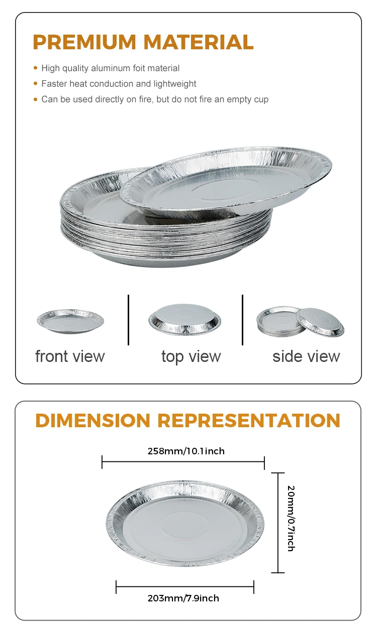 Reuniones familiares en reuniones familiares, el recipiente de aluminio de aluminio plateado de pizza de 10 pulgadas es, sin duda, un ayudante indispensable. Se puede usar para sostener los platos principales, como el pollo asado y los guisos, o como utensilios desechables para contener la comida sobrante, lo cual es conveniente y rápido para reducir la carga de la limpieza después de las comidas. Además, debido a sus características livianas y fáciles de transportar, es ideal para picnics al aire libre.