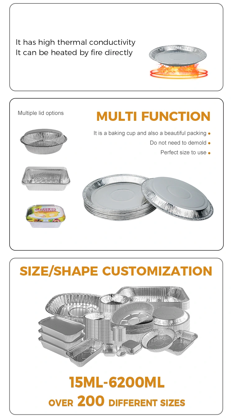 La forma trapezoidal de este producto no solo agrega estética, sino que también facilita la apilamiento y la almacenamiento, ahorrando efectivamente el espacio de almacenamiento. Al mismo tiempo, este diseño hace que sea más conveniente tomar artículos, y no se resbalará fácilmente cuando esté en la naturaleza, lo que mejora enormemente la seguridad del uso. Además, el recipiente de aluminio de aluminio plateado de pizza de 10 pulgadas tiene un diseño liviano, que es perfecto para picnics al aire libre. Puede llevarlo con usted en cualquier momento, en cualquier lugar y a hacer frente fácilmente a cualquier ocasión, ya sea en casa o al aire libre.