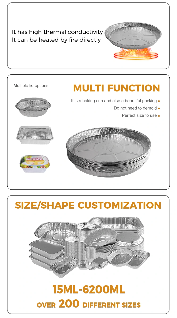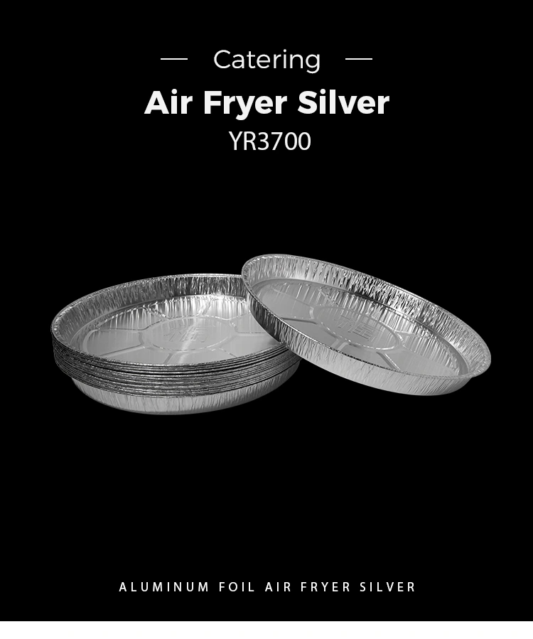 Proveedor de aluminio YUNCHU Modelo de aluminio YR3700 Aire Aire Freidante Freidora de aluminio plateado Se proporciona un recipiente de alimentos de aluminio de aluminio plateado. El contenedor tiene un diámetro de 406 mm (aproximadamente 15.9 pulgadas) en la parte superior, 360 mm (aproximadamente 14.1 pulgadas) de diámetro en la parte inferior, una altura de solo 40 mm (aproximadamente 1.5 pulgadas) y una capacidad de aproximadamente 3,700 ml (aproximadamente 130.5 oz). El vapor abierto de la llama es conveniente e higiénica, la horno de horno, la alta resistencia a la temperatura de 400 ° C no se quema ni se rompe, el horno de horno no es pegajoso, no teme a la barbacoa grasosa y intencional, debido a su capacidad de contactar directamente las llamas abiertas, los usuarios no necesitan preocuparse por los problemas de seguridad. Los recipientes de aluminio de aluminio son resistentes a altas temperaturas, altamente resistentes a la hornear y no son fáciles de quemar o romper. El borde del rollo completo no contiene aceite, evitando que los alimentos se adhieran a la pared de la olla, y la protección es más íntima.