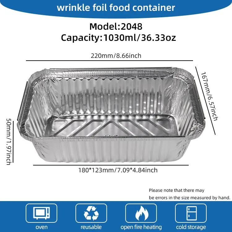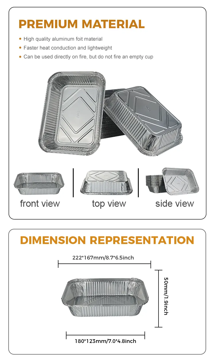 La lonchera desechable para hornear barbacoas de Yunchu Aluminium Foil Factory es adecuada para la mayoría de los escenarios, ya sea un restaurante de barbacoa, un restaurante occidental, un restaurante casero o una panadería, esta lonchera de papel de aluminio plateado puede mejorar la eficiencia. Los restaurantes de barbacoa pueden utilizarlo directamente para servir brochetas a la parrilla, verduras a la parrilla y mariscos a la parrilla. La apariencia plateada se combina con los ingredientes fragantes. Tiene un impacto visual total y llama la atención cuando se sirve. El diseño sin limpieza reduce la carga de trabajo de lavar platos en la cocina y ahorra costos de mano de obra. Es especialmente adecuado para comidas rápidas durante las horas punta. Las panaderías lo utilizan para servir pasteles horneados, tartas de huevo y galletas. Se pueden hornear directamente en el horno y no es necesario hornearlos después de hornearlos. Cambiar los platos y colocarlos directamente a la venta es conveniente manteniendo la temperatura y forma de los postres; Los restaurantes caseros se pueden utilizar para comida para llevar y el diseño a prueba de fugas puede evitar eficazmente que la sopa se derrame. La conservación del calor del papel de aluminio puede prolongar el tiempo de temperatura constante de los alimentos. Para acampar, hacer picnics, hacer barbacoas al aire libre y la molestia de llevar vajillas voluminosas y limpiarlas después de las comidas, esta lonchera desechable de papel de aluminio resuelve perfectamente los problemas de los viajes al aire libre. El material es fino y ligero y fácil de guardar. Se puede plegar y apilar a voluntad, sin ocupar espacio en la mochila y facilitando su transporte.