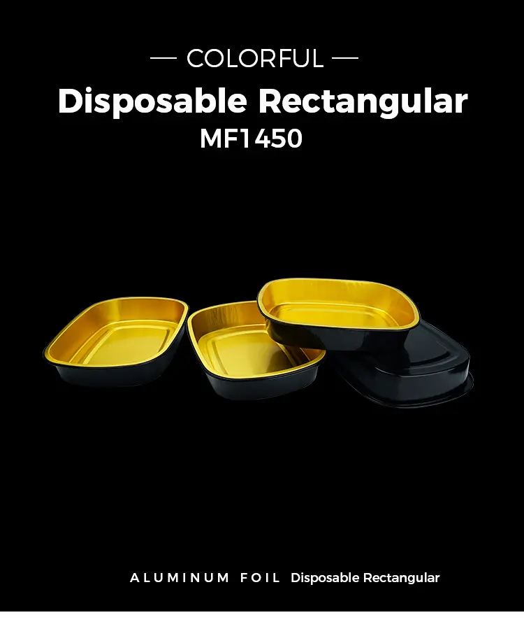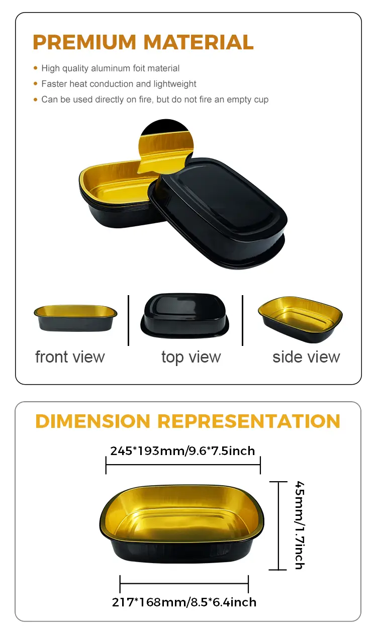 La bandeja de horno de oro negro desechable de los contenedores de aluminio rectangular MF1450 tiene un diámetro superior de 245*193 mm (9.6*7.5 pulgadas), un diámetro más bajo de 217*165 mm (8.5*6.4 pulgadas), una altura de 45 mm (1.77 pulgadas) y una capacidad de aproximadamente 1450 ml (51.1 ool).