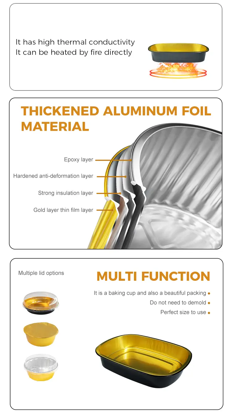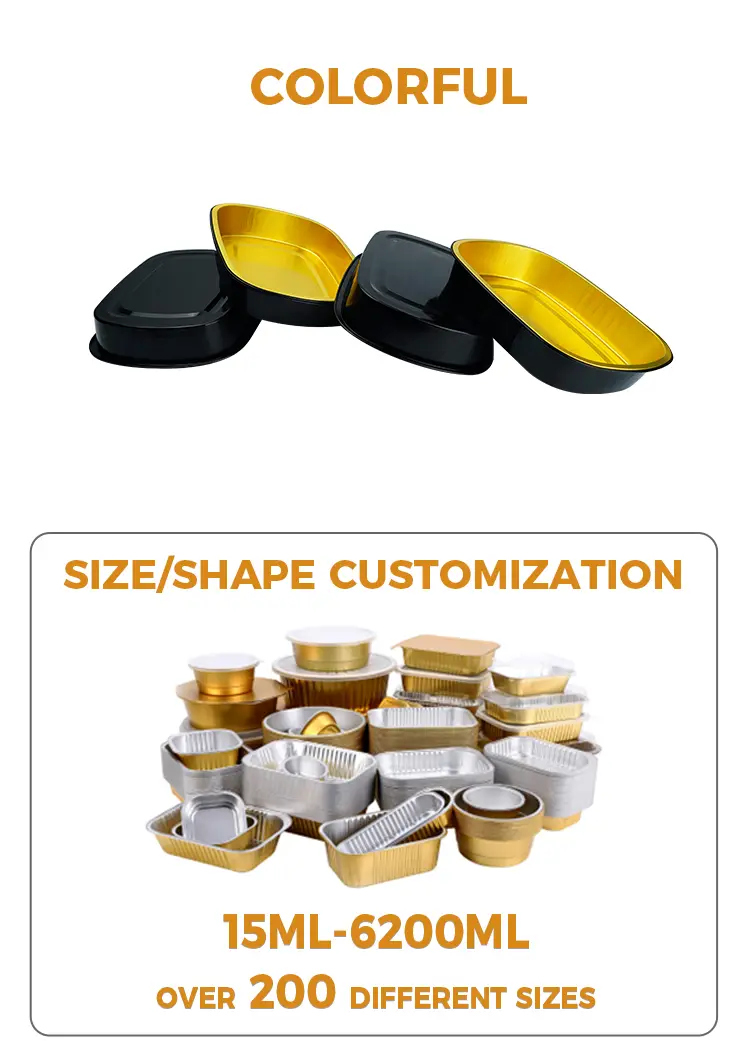 China Yunchu Foil de aluminio personalizado Bandeja de aluminio rectangular de oro desechable de oro desechable Los contenedores de aluminio rectangular se pueden colocar directamente en el horno, la parrilla de la barbacoa o el refrigerador. El producto tiene un peso ligero y se puede apilar fácilmente de manera cuidadosa y efectiva para ahorrar transporte, restaurantes y espacio familiar. El producto está hecho de tecnología de pared ligera, suave y ordenada. Es conveniente para los supermercados grandes para etiquetar y escanear códigos. El producto tiene una gran capacidad, se puede cargar con la mayoría de los alimentos grandes, el producto es desechable, sin necesidad de limpiar para ahorrar costos de mano de obra, el producto se usa con cubierta de aluminio de aluminio y una película de sellado de calor de aluminio de aluminio, sin fugas de aceites, no see a la flanada de agua, resistencia de alta temperatura y sin deformación, mejorar la frescura y la calentamiento y el calor de la conservación del producto y el efecto de transporte será mejor cuando se selló. Cumpliendo con los estándares de contacto de alimentos iOS9001 y SGS, los productos Coba se extienden por todo el mundo.