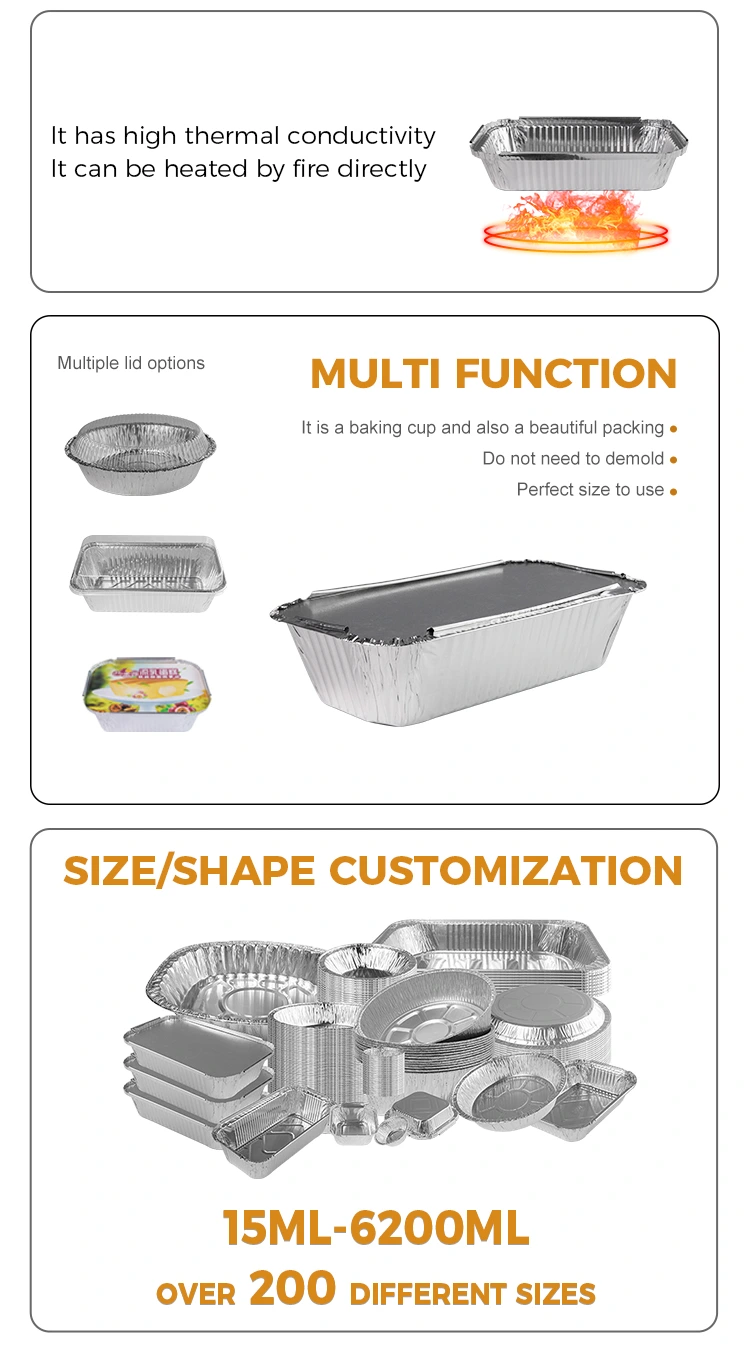 Este recipiente de aluminio de aluminio plateado de barbacoa de comida rápida desechable está hechos de material de aluminio de aluminio 8011 de alta calidad, que tiene un buen efecto de preservación de calor y puede mantener la temperatura de los alimentos, lo que hace que la comida sea más deliciosa y deliciosa. Además, nuestro contenedor de aluminio de aluminio plateado de barbacoa rectangular también está equipado con una función de aislamiento térmico, que se puede combinar con tapa de aluminio o tapa de plástico PET, que es conveniente para el logotipo personalizado y mejora aún más la imagen de la marca.