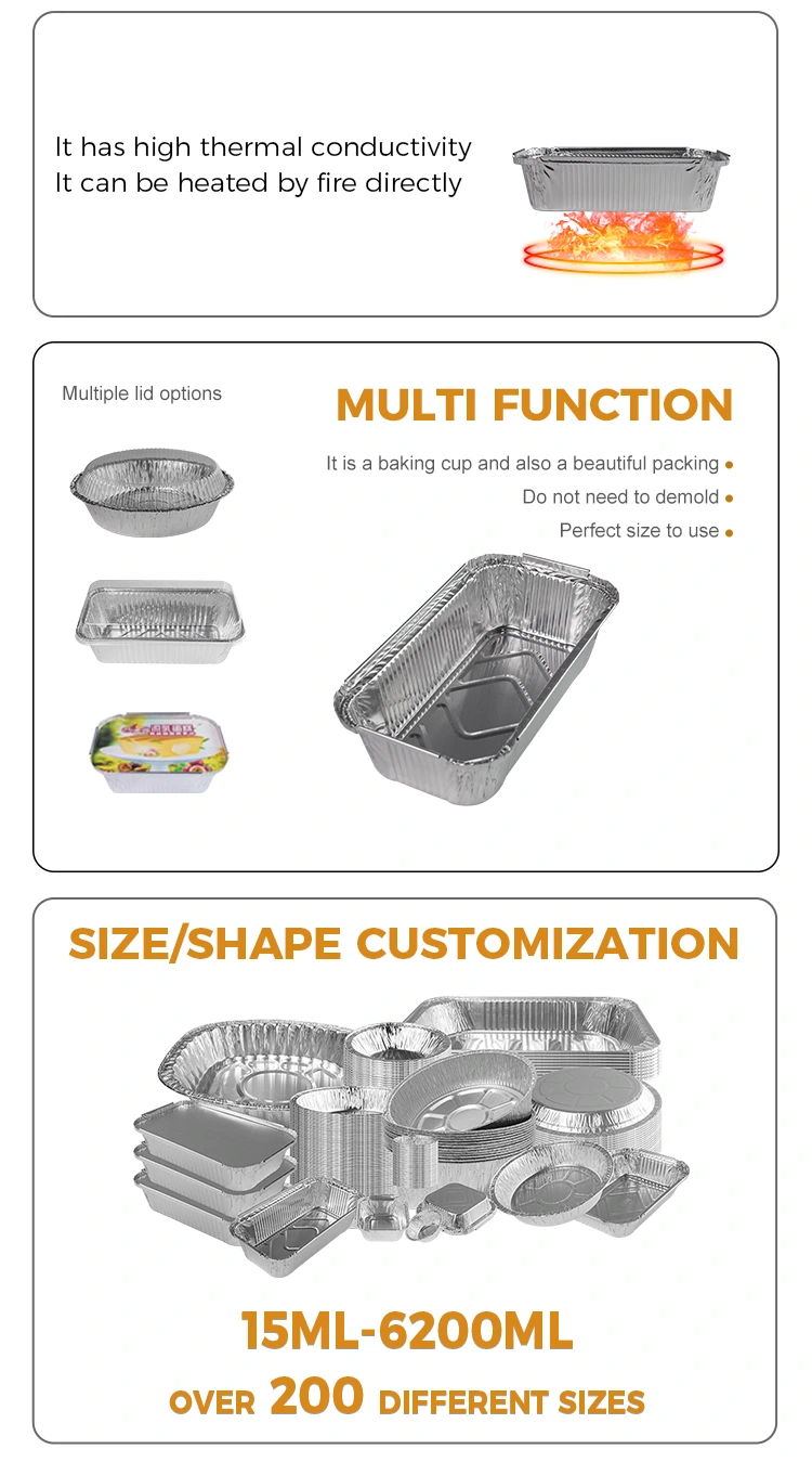 El proveedor de aluminio de aluminio plateado rectable rectable para hornear del proveedor de aluminio Yunchu es una herramienta de cocina versátil adecuada para varios métodos de cocción, como asar, olla caliente, gratina, embalaje para llevar y más. Este contenedor es lo suficientemente compacto como para adaptarse a una variedad de ollas y equipos, y viene en una variedad de tamaños para satisfacer las necesidades de diferentes barbacoas abiertas. Se puede utilizar para fabricar varios productos alimenticios, como freyers de aire y otras aplicaciones de equipos, resistencia al calor y al aceite, una cocción fácil.
