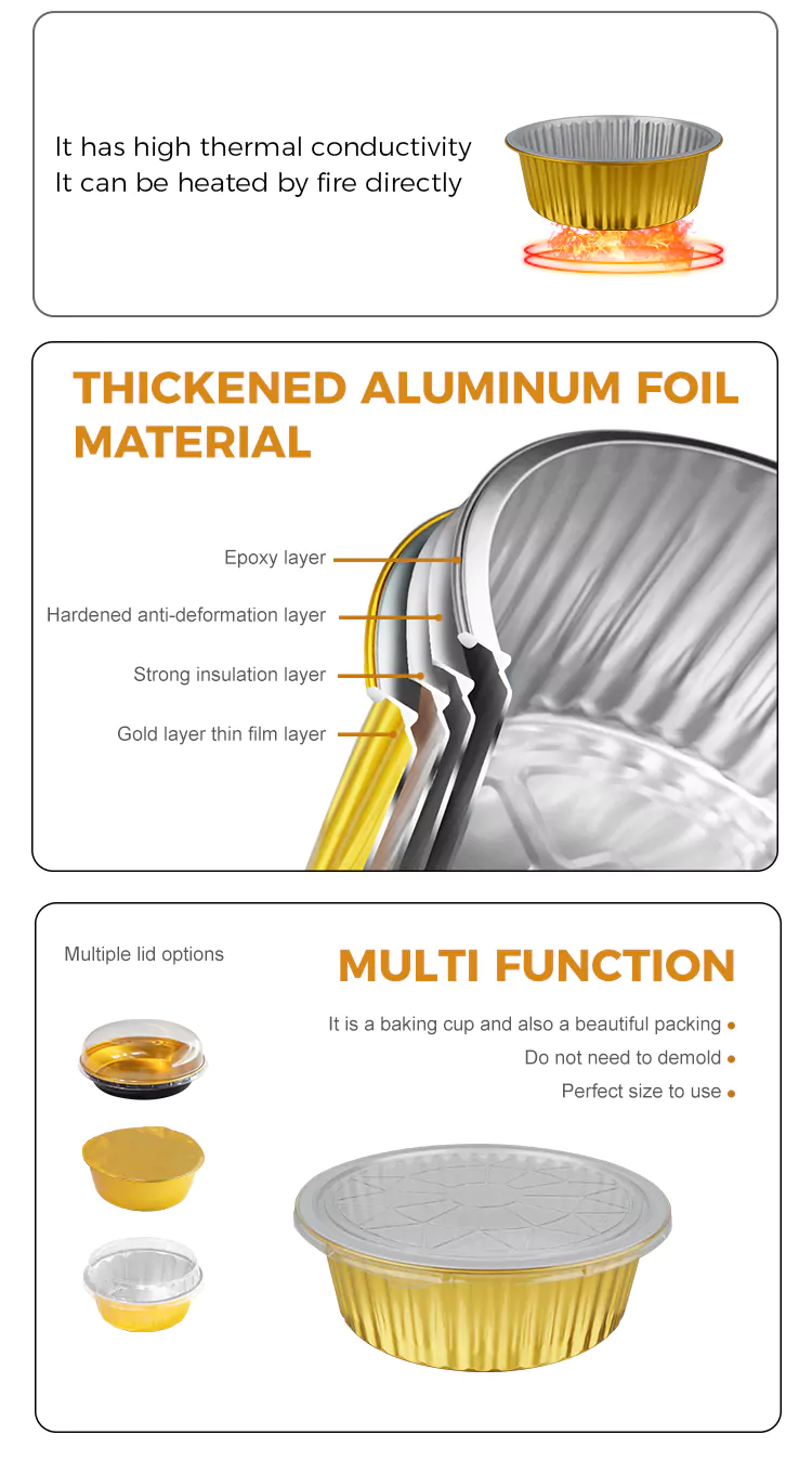 El papel de aluminio Yunchu le proporciona recipientes de papel de aluminio dorados, redondos, desechables, de gran capacidad y de alta calidad. Hemos adoptado un diseño de apariencia llamativa, haciéndolos de alto nivel de apariencia y practicidad. Los escenarios de aplicación incluyen cocinas domésticas, empresas de catering, estudios de repostería, etc.