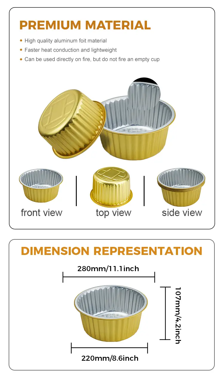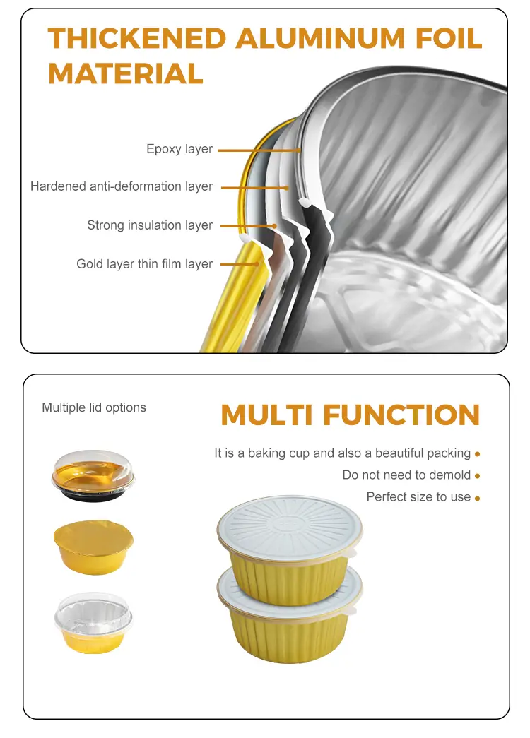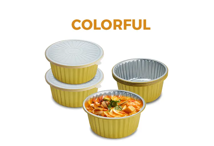 Yunchu Supplier This Disposable Sealable Golden Round Aluminum Foil Containers can provide high-temperature resistant translucent PP lid, laminated heat-sealing aluminum foil lid is optional, and adopts dust-proof and leak-proof safety for the container mouth, which is suitable for pre-made dishes, refrigerated food storage, soup ingredients, etc. This Disposable Sealable Golden Round Aluminum Foil Containers is suitable for most Cocina de gran volumen, y tenemos un servicio personalizado, que puede personalizar el logotipo, la impresión de patrones, etc. para mostrar la identidad de la marca.