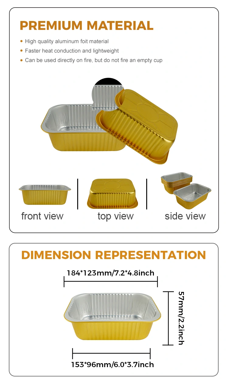 Proveedor de aluminio de Yunchu Sellado cuadrado de aluminio gratino Los contenedores de aluminio están cuidadosamente hechos de material de aluminio de aluminio de alta calidad de grado alimenticio, que se puede usar con tapa de sellado de aluminio, que tiene un excelente rendimiento de sellado, resistencia a la alta temperatura y resistencia al aceite y a las fugas. Se usa ampliamente en varios escenarios, como envases de alimentos, calefacción, refrigeración y entrega para llevar. La superficie está diseñada con una pared ligera, y la apariencia es plana y suave, lo cual es conveniente para el sellado automático de la película de sellado de calor, para mejorar la eficiencia del envasado.