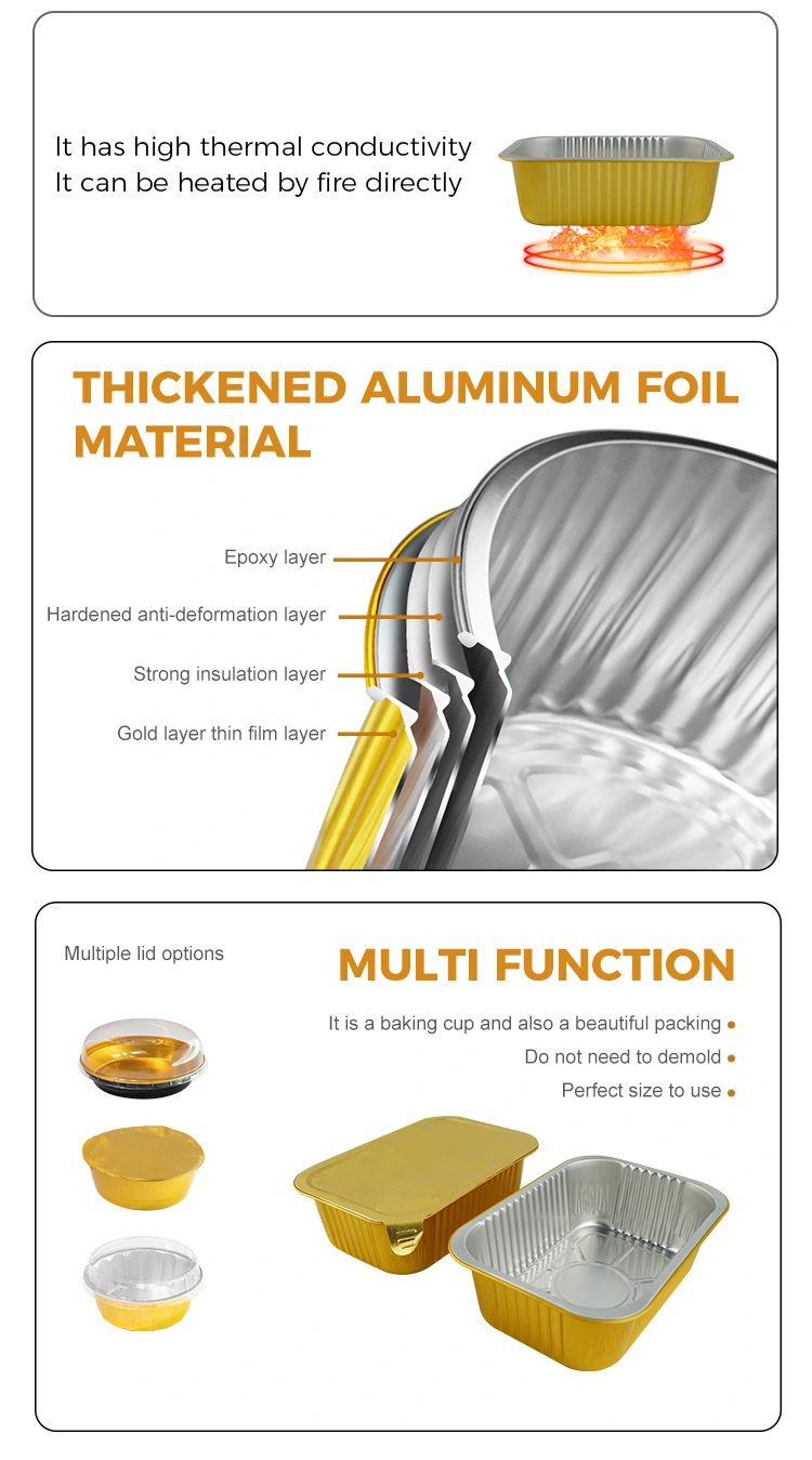 Los contenedores de aluminio de aluminio de aluminio de aluminio Yunchu, adecuados para un solo porción de arroz horneado o pasta horneada y otros platos, empaquetado, empaquetado lonchera y comida para llevar, los platos prefabricados pueden elegir productos de embalaje, esta línea de aluminio de foil de gratinum de focas de gratina desechables. Con la película de sellado de calor, puede lograr un sellado eficiente y evitar efectivamente la fuga de sopa, que es adecuada para equipos de sellado automático. La superficie del contenedor es suave y plana, lo cual es fácil de etiquetar, y es hermosa y generosa, lo que ayuda a mejorar la imagen de la marca. Es resistente a temperaturas altas y bajas, se puede usar en un rango de temperatura de -20 ° C a 250 ° C, y admite una variedad de métodos de calentamiento como refrigeración, horneado y vapor. El material de aluminio de aluminio es 100% reciclable y sostenible.