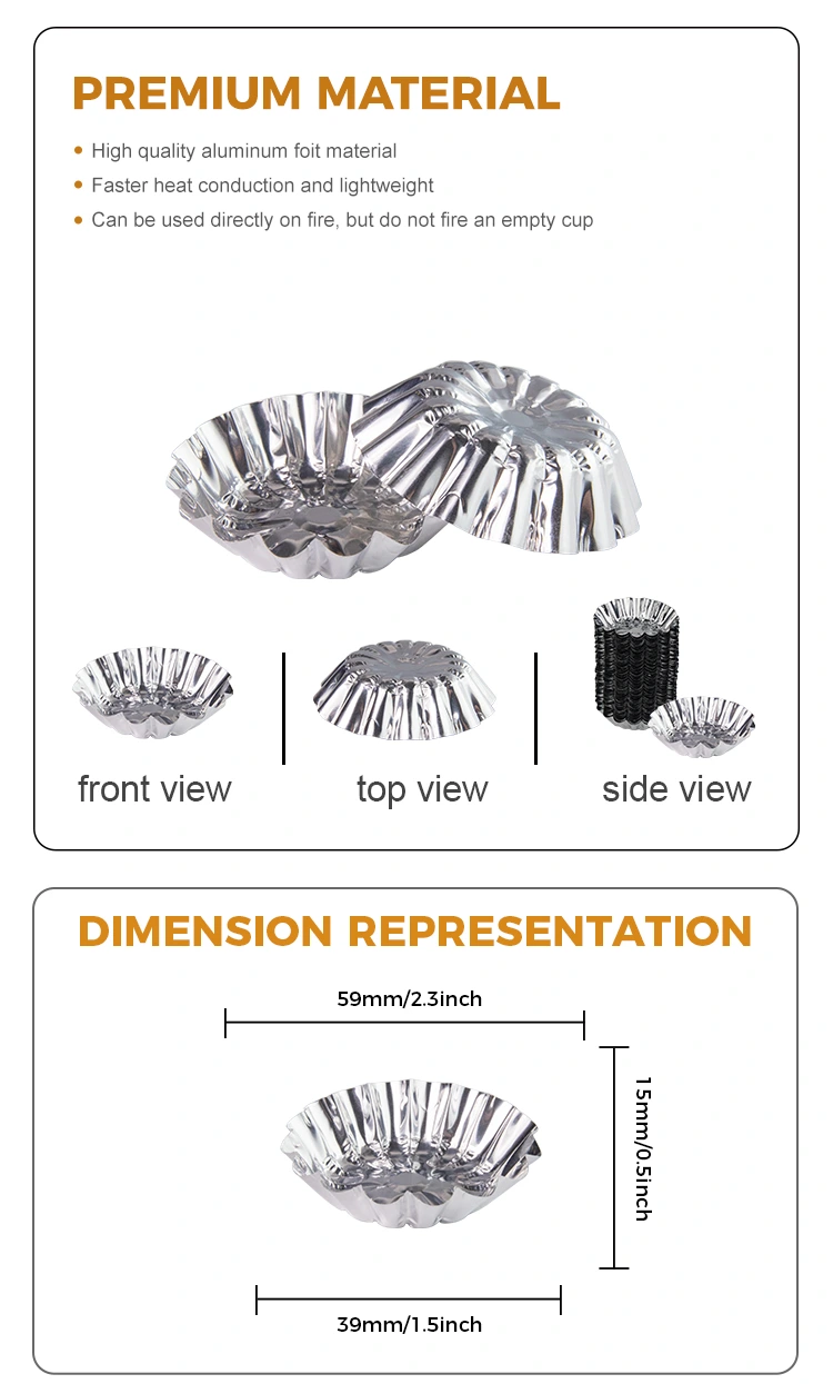 Yunchu aluminum foil supplier's Egg tarts are baked in an air fryer Silver Aluminum Foil Food Container, non-slip cup body, anti-slip pattern of the cup body, increase friction, prevent slipping, curled cup mouth, rounded curled cup mouth design does not hurt hands, multiple large capacity design, one-time use, no need to clean laboriously, wide range of uses, can be used for baked egg tarts, cakes, egg yolk crisps, Tortas de tazón y otras delicias. Yunchu ha aprobado la certificación ERP alemana, la certificación SGS de la UE y la certificación del sistema de gestión de calidad ISO9001. Utilizamos materiales saludables y amigables con el medio ambiente para garantizar la seguridad y la no toxicidad de nuestros productos. Estos materiales no solo son renovables sino también ecológicos, lo que refleja nuestros estrictos requisitos en la seguridad alimentaria y nuestro compromiso de buscar estándares de alta calidad para nuestros productos generales.