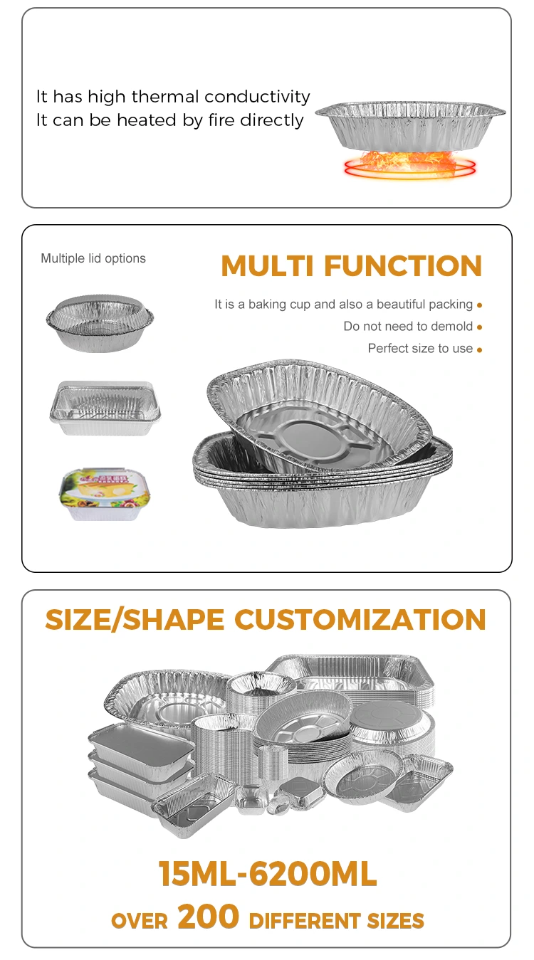 Este producto es un producto desechable y no necesita limpiarse, lo que ahorra los costos de mano de obra. Se puede combinar con tapa de aluminio de aluminio PET totalmente transparente, lo que evita efectivamente el polvo y la fuga de líquido. La durabilidad y la seguridad del producto se ven mejoradas por el diseño de los refuerzos y la forma cóncava y convexa regular del fondo. El diseño portátil facilita el transporte y el calor, resistente a temperaturas altas y bajas, se puede usar en un rango de temperatura de -20 ° C a 250 ° C, y es impermeable al aceite y el agua, lo que mejora la retención de calor y la opresión del transporte del producto.