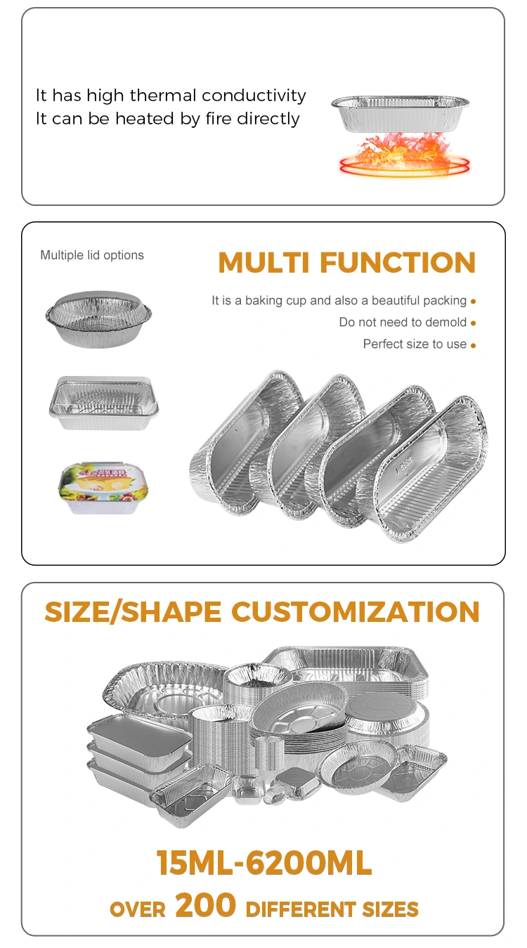 El recipiente de aluminio de aluminio plateado de aire de aire cuadrado está hecho de material de aluminio de aluminio de alta calidad, que es liviano y duradero. La parte superior está equipada con una tapa transparente de mascotas personalizable, y la parte inferior está equipada con una tapa que se exprime y se fija en la caja lateral, lo que puede evitar que los alimentos se adhieran a la bandeja para hornear, lo que facilita la liberación y la limpieza, y al mismo tiempo facilitar el transporte y el uso.