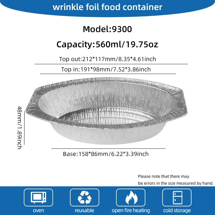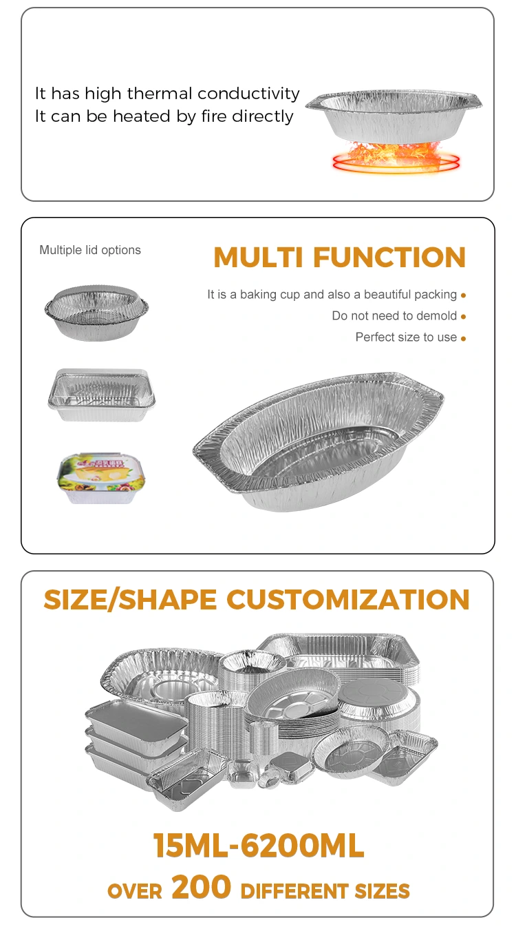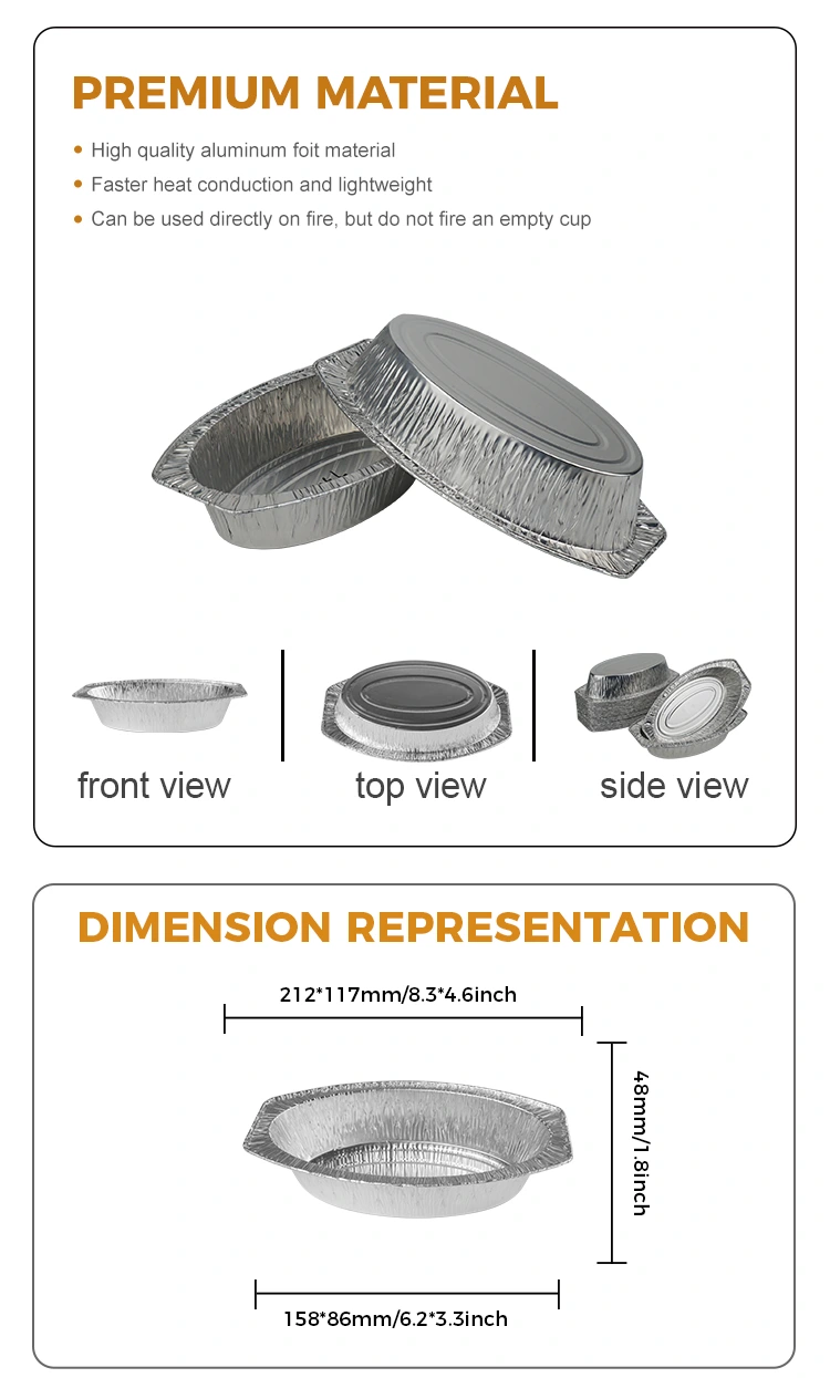 El proveedor de aluminio de Yunchu ofrece recipientes de aluminio de aluminio de plata ovalados para cocinar para la casa, panaderías, cadenas de tiendas y entrega de alimentos refrigerados. Hecho a partir de material de aluminio de aluminio de grado alimenticio, este contenedor presenta una forma ovalada única que lo hace destacar entre las muchas cajas de hornear plateadas. Este contenedor es especialmente adecuado para mantener pañuelos calientes, frutas, pan y todo tipo de alimentos para replicar, y puede satisfacer las necesidades de una amplia gama de vajillas. Debido a su buena conductividad térmica, puede disipar uniformemente altas temperaturas, asegurando que los alimentos se calienten de manera uniforme. Además, tiene una cierta capacidad de carga y resistencia a la presión, manteniendo la estabilidad incluso en el caso de múltiples pilas, evitando la deformación y es ideal para su uso durante el transporte. Para adaptarse mejor a diferentes escenarios y necesidades, este contenedor también se puede personalizar de acuerdo con los requisitos del cliente y proporcionar tapas coincidentes para mayor practicidad.