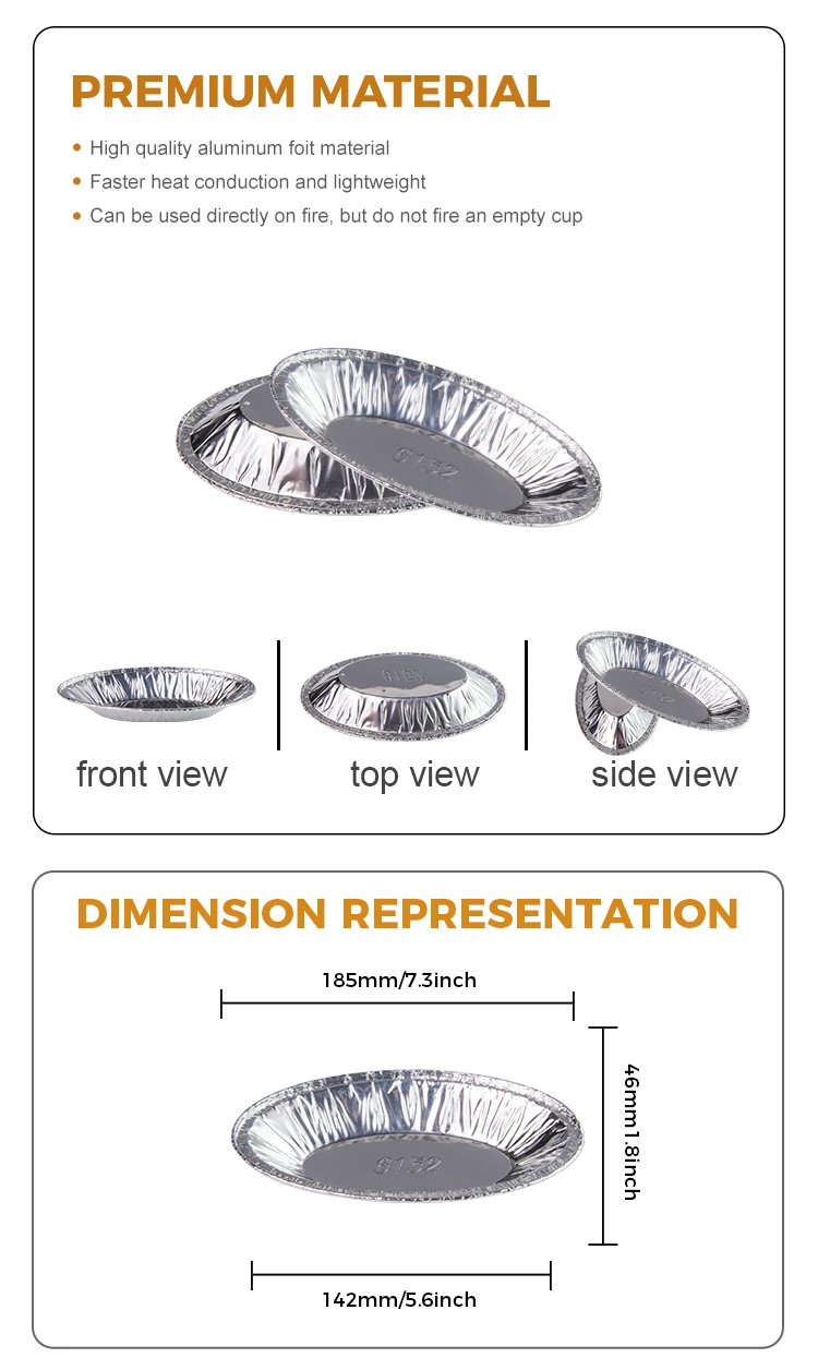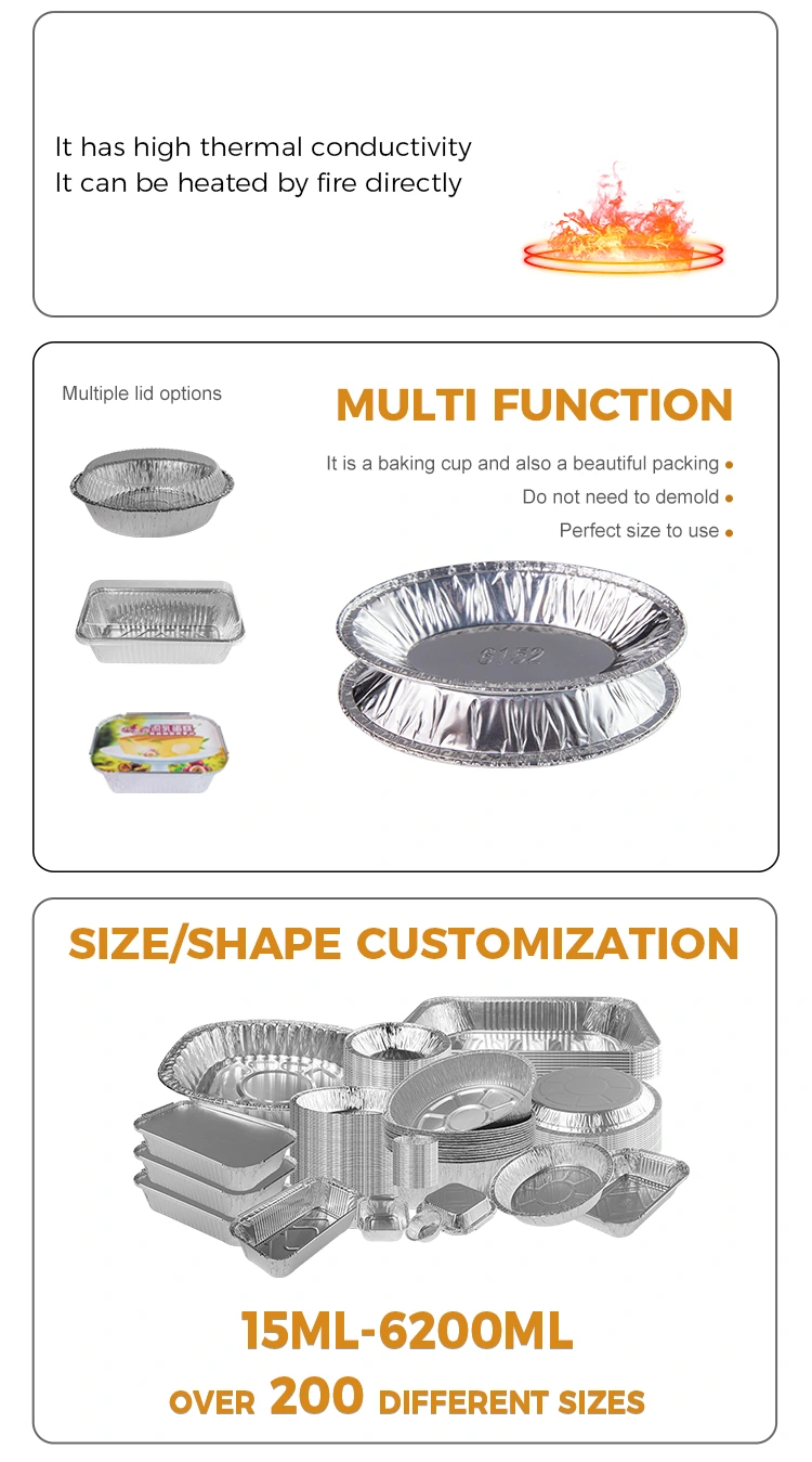 Los recipientes de aluminio de aluminio de plata ovalos producidos por Yunchu Aluminium Foil Factory han ganado el favor del mercado con su diseño único y excelente funcionalidad. Este producto utiliza tecnología avanzada para lograr un diseño de moldeo de una pieza que garantice incluso la calefacción y el fundamento fácil, lo que la hace muy conveniente para las tartas y los pasteles para hornear. Es moderadamente grueso y lo suficientemente duradero como para soportar altas temperaturas para hornear.