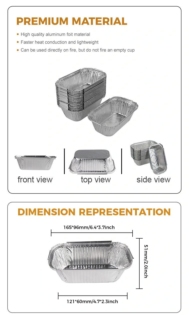 Los contenedores de aluminio de aluminio de plata rectangulares de 2044 al por mayor del proveedor de aluminio Yunchu de aluminio son adecuados para una variedad de escenarios, ya sea una barbacoa al aire libre o una reunión familiar. Los comerciantes pueden personalizar patrones e impresión de acuerdo con sus necesidades, por lo que es una opción única para el empaque para llevar que llama la atención de los clientes. El contenedor admite calefacción de llama abierta y calentamiento de lámparas de aceite, y realiza calor de manera uniforme, asegurando que la comida se calienta de manera uniforme y no es fácil de seguir con la sartén. Se puede usar inmediatamente incluso cuando se coloca en la freidora de aire, y el diseño cóncavo y convexo en la parte inferior aumenta la fricción y evita el deslizamiento. Los refuerzos en los lados mejoran la robustez del producto, mientras que el diseño del dobladillo garantiza un ajuste cómodo en la tapa, bloqueando efectivamente la temperatura de los alimentos.