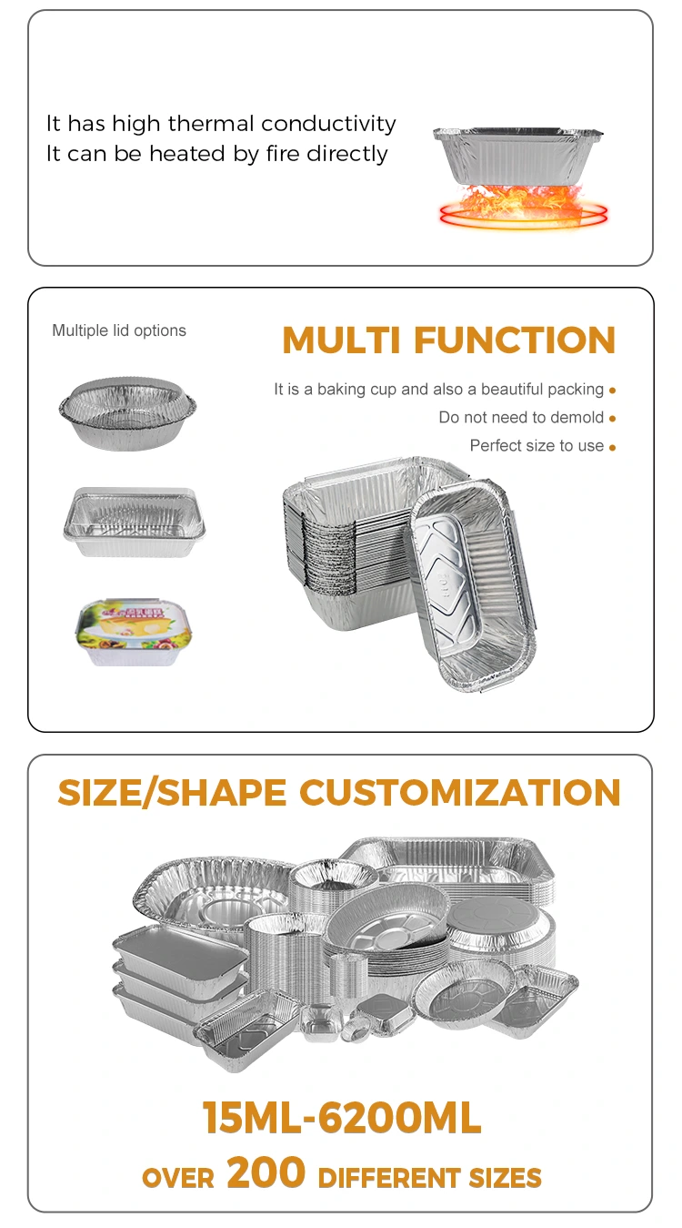 Características: La lonchera de aluminio que proporcionamos está hecha de material de aluminio 8011, que tiene un excelente rendimiento de preservación de calor y puede mantener efectivamente la temperatura de los alimentos, lo que hace que sus alimentos sean más atractivos. En particular, nuestros contenedores de aluminio de aluminio de plata rectangular al horno no solo tienen propiedades de aislamiento térmico, sino que también se pueden combinar con las tapas de aluminio o las tapas de plástico PET para facilitar la personalización personalizada de los logotipos, mejorando así los puntos de memoria del cliente y mejorar la conciencia de la marca.