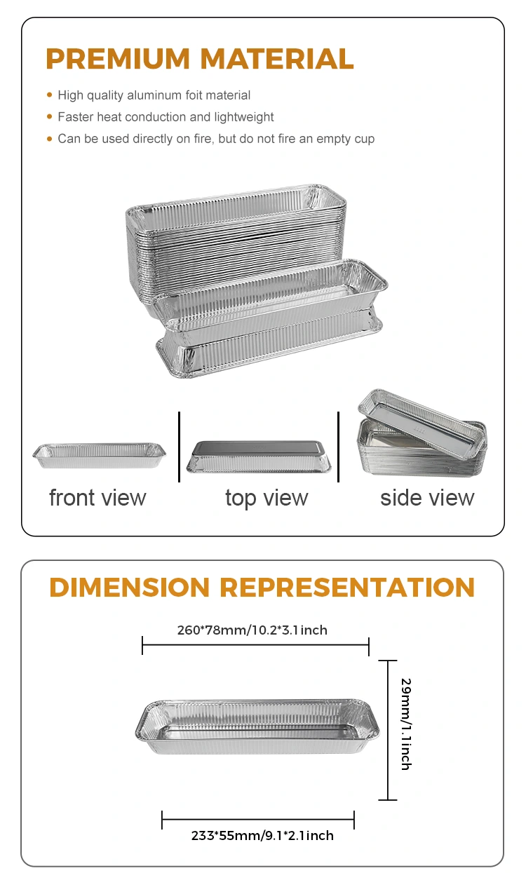 Características: La lonchera al por mayor está hecha de material de aluminio 8011, que tiene un buen efecto de preservación de calor y puede mantener la temperatura de los alimentos, lo que hace que la comida sea más deliciosa y deliciosa. Además, nuestro contenedor de aluminio de aluminio plateado de barbacoa rectangular también tiene una función de aislamiento de calor y puede combinarse con tapa de aluminio de aluminio y tapa de plástico PET.
