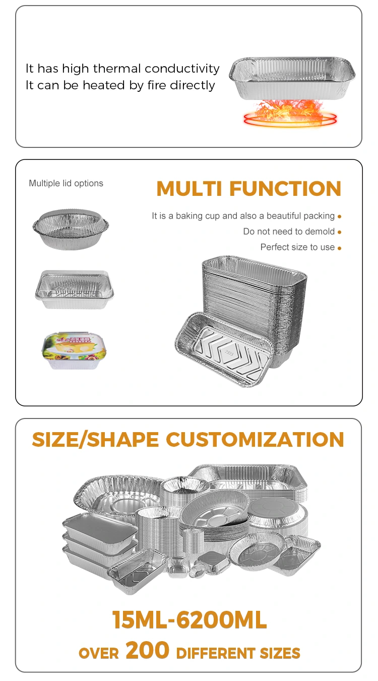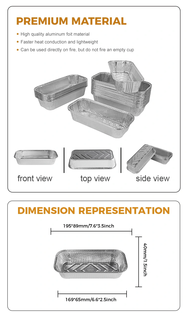 Características: la lonchera al por mayor de aluminio 8011 El material de aluminio está hecho de una buena preservación del calor, que puede mantener la temperatura de los alimentos y hacer que la comida sea más deliciosa. Además, nuestro contenedor de aluminio de aluminio plateado de barbacoa rectangular también tiene una función de preservación de calor, que se puede combinar con tapa de papel de aluminio y tapa de plástico para mascotas, lo que es conveniente para personalizar su logotipo, profundizar aún más la impresión del cliente y mejorar su imagen de marca.
