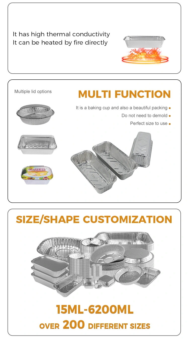 La bandeja rectangular de la bandeja para hornear recipientes de aluminio de aluminio plateado proporcionados por el proveedor de aluminio Yunchu está disponible en una variedad de tamaños y especificaciones, adecuados para todo tipo de equipos de olla. Ya sea que se trate de una parrilla grande o un pequeño horno casero, puede manejarlo con facilidad. Viene en una variedad de tamaños y puede satisfacer las necesidades de varias barbacoas abiertas, ya sea una barbacoa al aire libre o un uso temporal como plato, no habrá ningún problema.