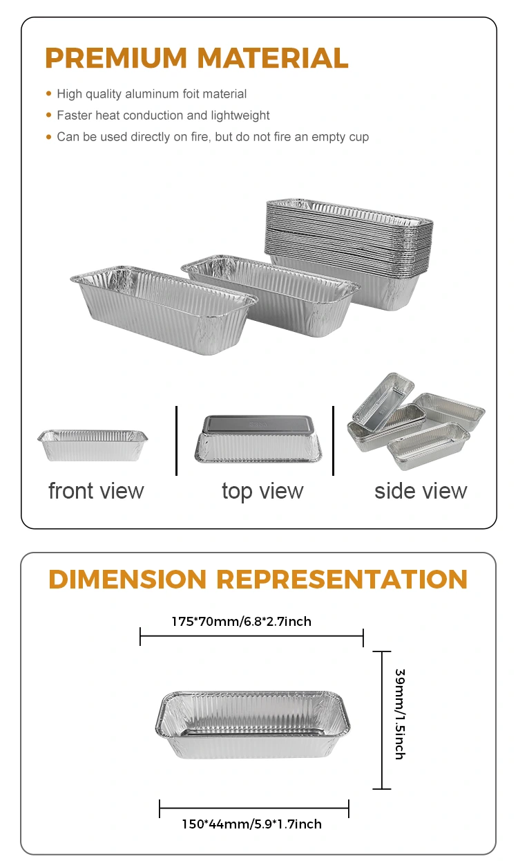 La bandeja de pan rectangular de los contenedores de aluminio de aluminio plateado proporcionados por el proveedor de aluminio Yunchu de aluminio está hecho de materiales de grado alimenticio y es adecuado para una variedad de escenarios de aplicación. Este producto es particularmente adecuado para la parrilla y la hornear, como hacer largos panes de pan o hornear. Ya sea para la parrilla de carbón o como una caja de entrega para llevar, es perfecto para su uso.