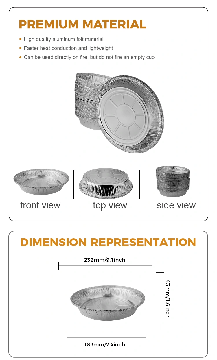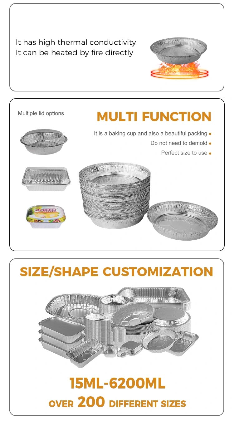 El proveedor de aluminio de Yunchu produce contenedores de aluminio de aluminio plateado al por mayor, el material se ha espesado, el contacto directo con la seguridad alimentaria y la paz, puede hornear directamente los alimentos, simples y convenientes para usar, siempre que se ponga en el air fryer o el horno, etc., pueden hacer alimentos, uniformes, uniformado y actos a temperatura altas, a la temperatura alta, no se acumulan en la temperatura de aire, lo que se pone a la temperatura, etc.. -20 ° C ~ 250 ° C no se puede pegar ni romperse, elegir materiales engrosados ​​de alta calidad, protección del medio ambiente de grado alimenticio y sin contaminación, use más asegurado. Los contenedores de aluminio de aluminio plateado del horno de aire redondo de aire son adecuados para escenas como restaurantes, restaurantes de cantina, cadenas de tiendas, alimentos refrigerados, comida para llevar, etc. Ya sea para uso al por mayor o minorista, esta bandeja de hornear lo tiene cubierto. La bandeja para hornear tiene una cierta capacidad de carga y durabilidad, y puede mantener su forma incluso cuando se apila, y no es fácil de deformarse durante el transporte. Para mejorar aún más la experiencia del usuario, los usuarios también pueden optar por usarla con tapas de aluminio y tapas de mascotas totalmente transparentes.