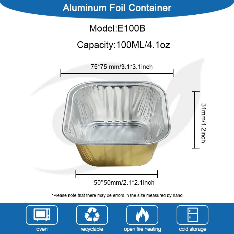 Square baking cakes Smoothwall Aluminum Foil Containers E100B has an upper diameter of 75*75mm (2.9*2.9 inches) and a lower diameter of 50*50mm (1.9*1.9 inches), The height is 31mm (1.2 inches), the capacity is about 100ml (3.5oz), the aluminum foil cup body is light and compact, the size is exquisite, easy to carry, the structure is strong, not easy Para deformar, no deslizamiento y a prueba de fugas, puede permanecer estable incluso en el caso de la calentamiento de alta temperatura, el producto puede soportar una temperatura alta a 220 ° C, y también puede refrigerarse directamente y almacenarse, adecuado para una variedad de equipos de calentamiento de cocina como hornos, fryers de aire, hornos de microondas, vapor (calefacción sin tapa). Se puede calentar directamente, ahorrando la molestia de reemplazar los platos y los platos nuevamente y mejorar la eficiencia de producción.