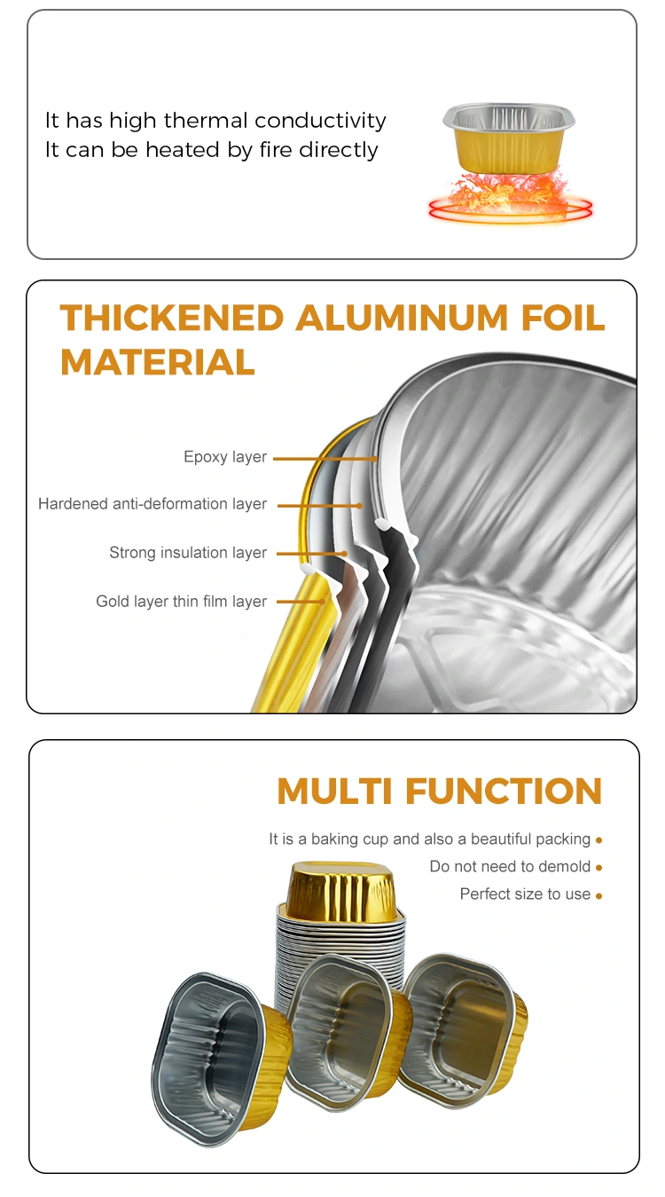 Tazas cuadradas para hornear postres Los recipientes de papel de aluminio de pared lisa tienen un gran espesor, una fuerte resistencia a la corrosión, no se deforman fácilmente y pueden estar en contacto directo con los alimentos. Todos los productos han pasado la certificación del sistema de gestión de calidad ISO 9001 y se producen en estricta conformidad con las normas de seguridad de materiales en contacto con alimentos de la FDA. Se garantiza que no son tóxicos ni tienen olor y se pueden utilizar con confianza.