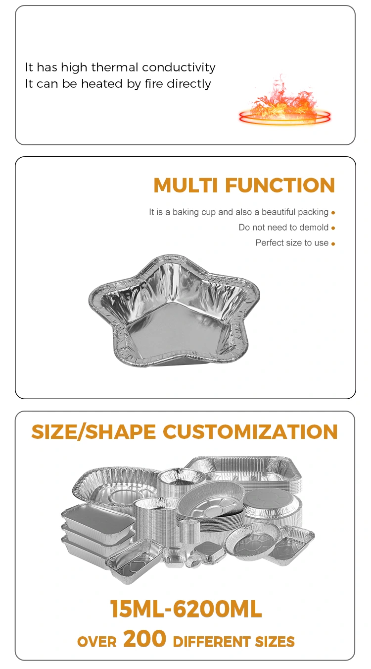 Proveedor de papel de aluminio Yunchu Tazas de tarta de papel de aluminio en forma de estrella para hornear El recipiente para alimentos de papel de aluminio es un recipiente de papel de aluminio plateado para hornear de alta calidad. Este producto es práctico y soluciona eficazmente problemas a la hora de elaborar tartas o comidas pequeñas, como lavar sartenes y restos de grasa. Las paredes internas y externas del fondo de los moldes para tartas de papel de aluminio en forma de estrella para hornear Recipiente para alimentos de papel de aluminio están diseñadas para ser lisas, evitando que se peguen después de hornear y evitando que se quemen en el fondo.